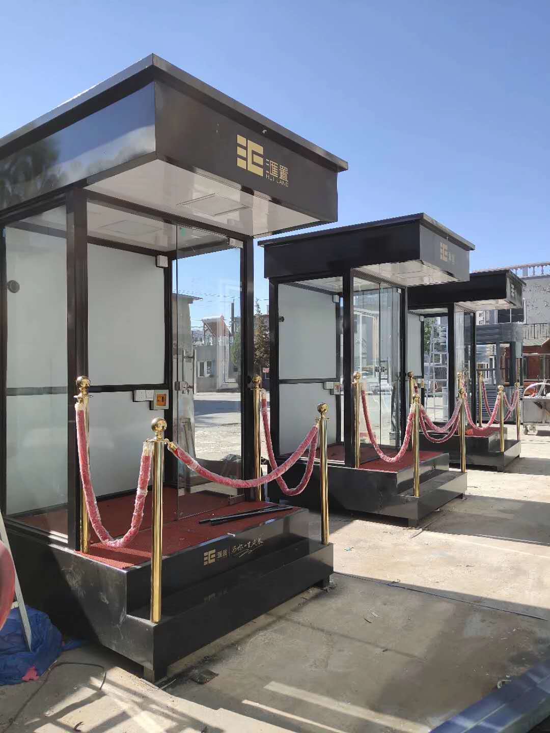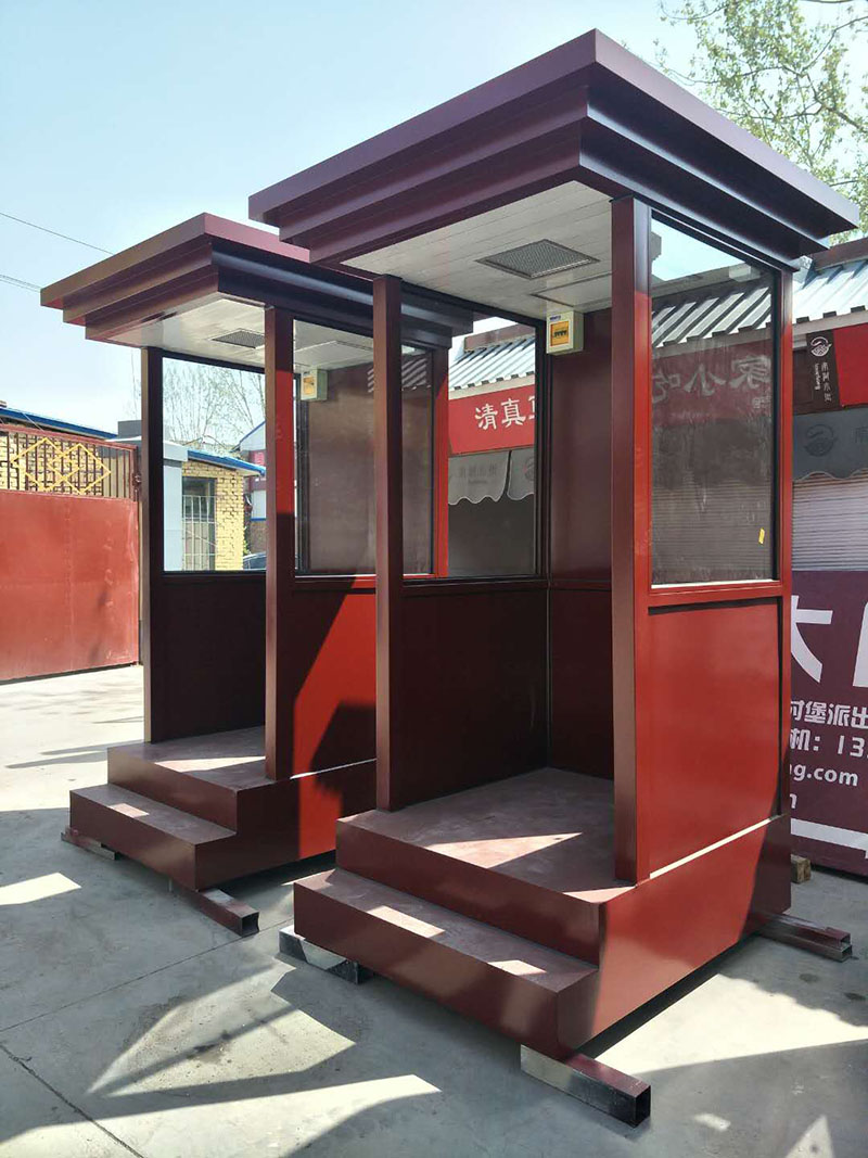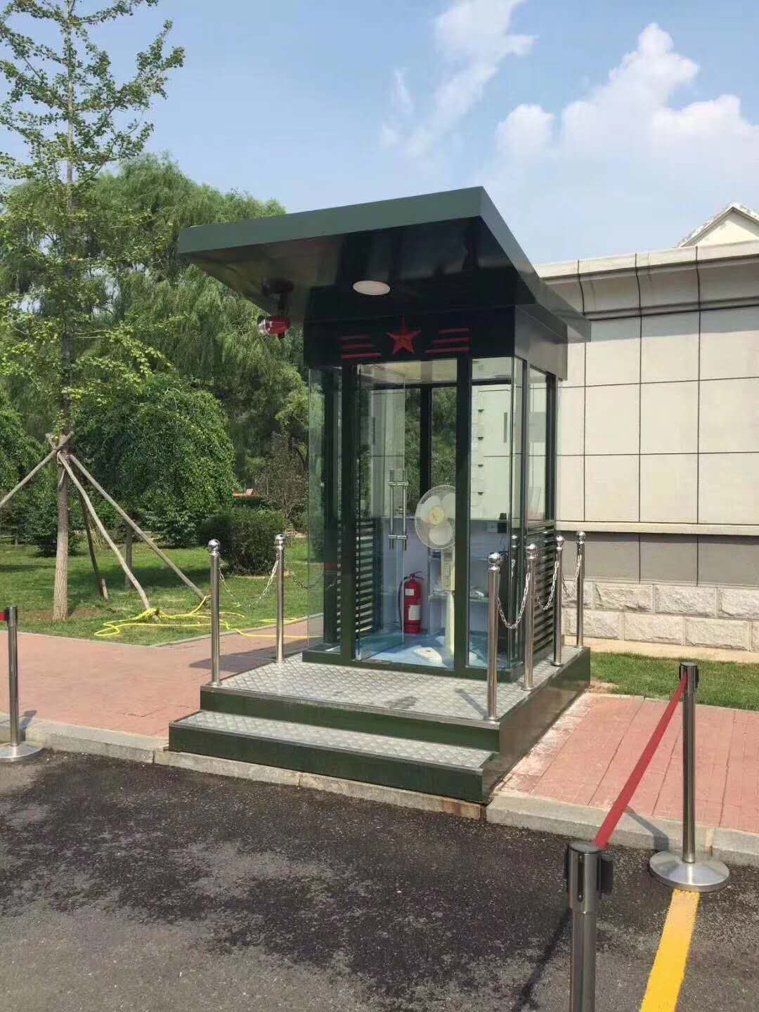值班崗?fù)さ闹饕埞菫殇摻Y(jié)構(gòu)龍骨,起尺寸為40x60x1.5mm鍍鋅龍骨;立柱一般為堅固耐用的型鋼,尺寸規(guī)格有80x80x2.0mm,40x80x2.0mm等等,可根據(jù)產(chǎn)品的大小不同而來決定立柱的大??;玻璃一般為8mm鋼化玻璃,具有較強的抗沖擊力,即使破碎也不會傷到人;地板為3mm防滑鋼板,鋪紅色地毯,四周可用鈦金立柱和紅絨繩作為裝飾件,使產(chǎn)品看起來更美觀,大氣,高檔。